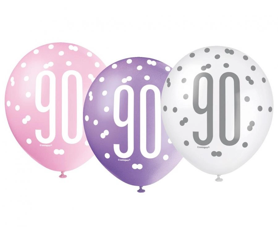 Balony 12" Glitz z nadrukiem 90 to zestaw 6 balonów o średnicy około 30 cm w kolorach różowym, fioletowym i białym. Przeznaczone do dekoracji urodzinowych i jubileuszowych (90 lat) oraz imprez okolicznościowych; można je napełnić powietrzem lub helem i łączyć z innymi dekoracjami.