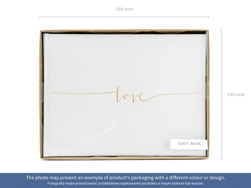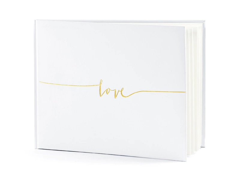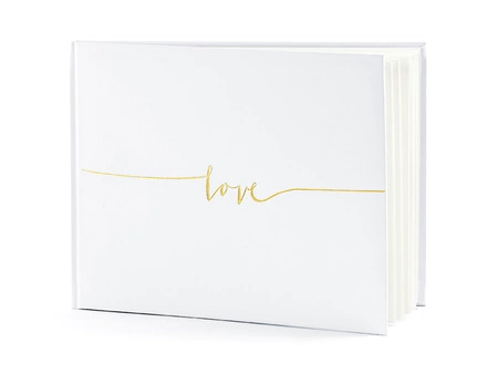 - Księga Gości oprawiona papierem w kolorze kremowym, ze złotym napisem Love, wymiary 24x18,5 centymetra, 22 kartki, bez tekstu.