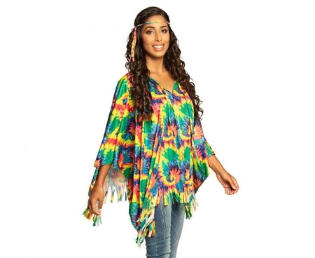 Ponczo hipisa to zestaw przebrania zawierający wielobarwne ponczo oraz dopasowaną opaskę na głowę. Produkt w rozmiarze uniwersalnym, wykonany w większości z poliestru (100% poliester), przeznaczony na tematyczne imprezy takie jak wieczór panieński, urodziny, Halloween czy baby shower. Zestaw: 1 szt.