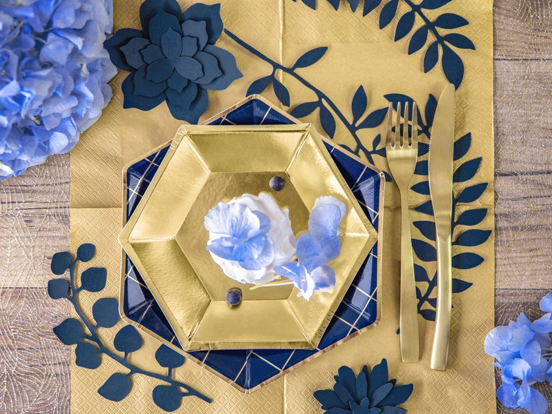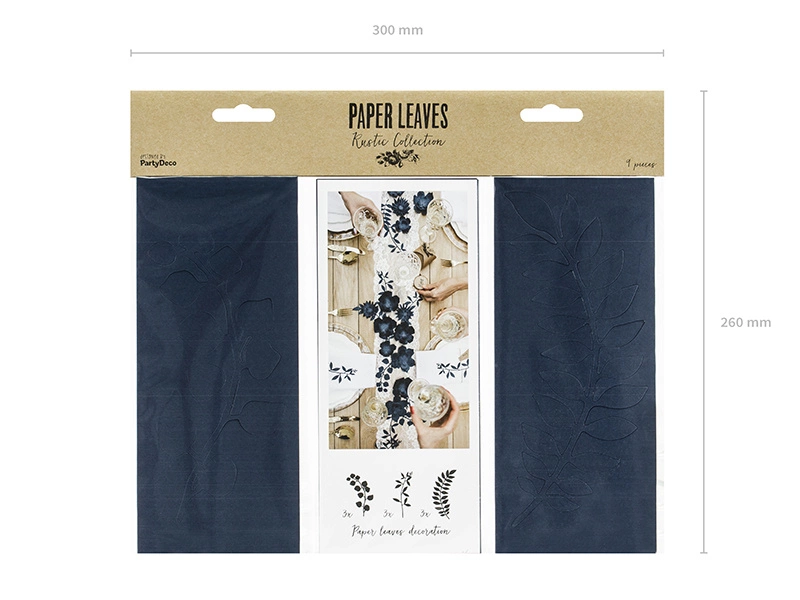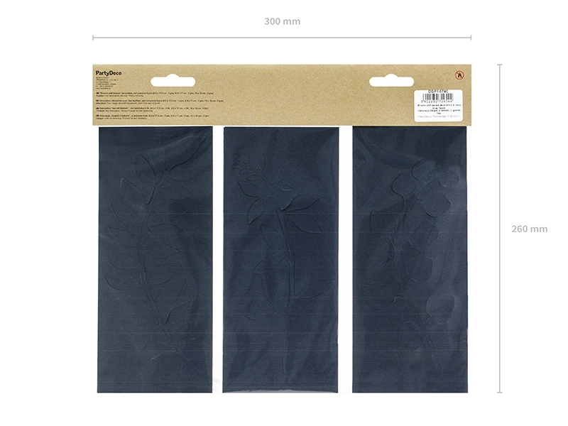 - Dekoracja Gałązki z listkami w kolorze ciemnogranatowym, wykonana z papieru, mix wzorów, wymiary ok.: 6,5 x 17,5 cm (3 szt.), 8,5 x 17 cm (3 szt.) i 10 x 19 cm (3 szt.). (1 op. / 9 szt.)