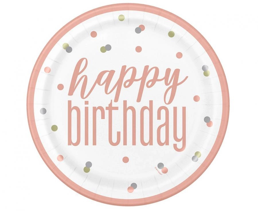Papierowe talerzyki Glitz Happy Birthday, średnica 23 cm, 8 sztuk w kolorze różowo‑złotym z nadrukiem „Happy Birthday” i groszkami. Produkt plastic‑free, wykonany w 100% z papieru. Przeznaczone głównie na przyjęcia urodzinowe do serwowania ciast i przekąsek; lekkie i łatwe do przechowywania.