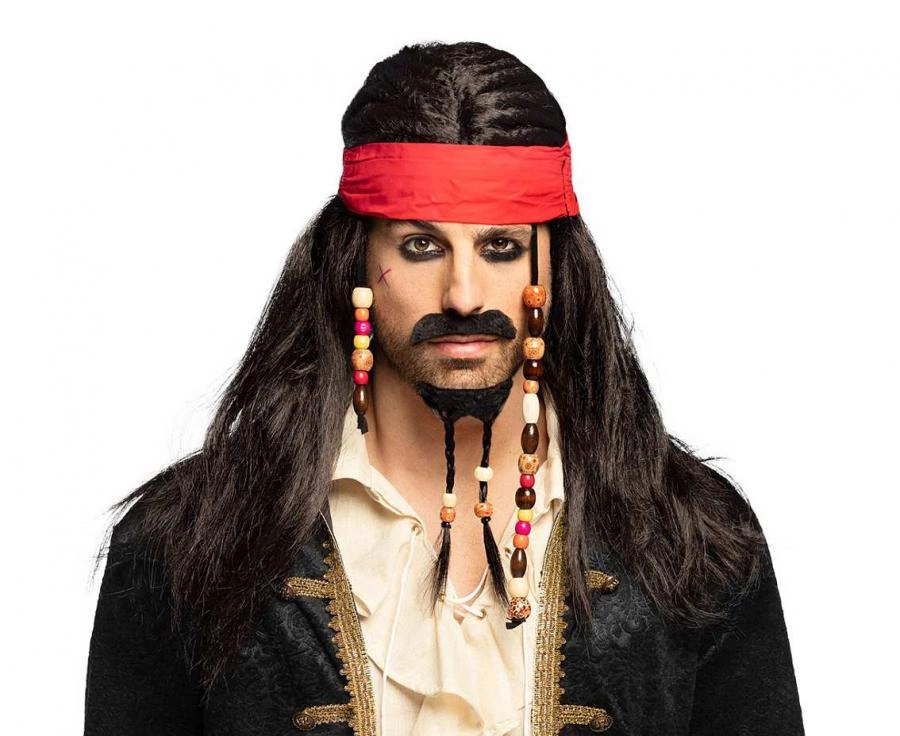 Peruka pirata "Tobias" z czerwoną chustą, wąsem i brodą to kompletny element stroju na imprezy kostiumowe i tematyczne: Halloween, wieczór panieński, urodziny czy przedstawienia. Uniwersalny rozmiar, włosy 66 cm, broda 17 cm, wykonana z poliestru; szybkie dopasowanie dzięki taśmie samoprzylepnej.