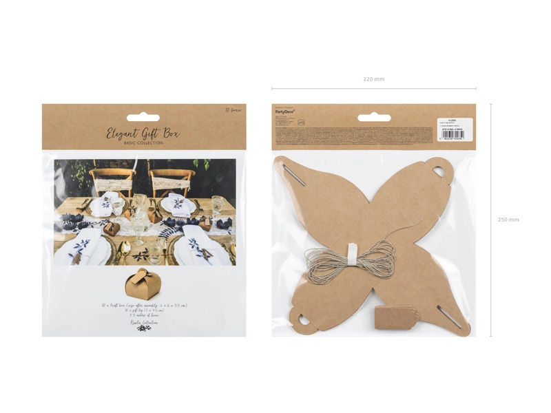 - Pudełeczka z zawieszkami wykonane z papieru kraft, w zestawie: 10 pudełek (wymiary po złożeniu ok. 6 x 6 x 5,5 cm), 10 zawieszek (wymiary ok. 2 x 4,5 cm) i ok. 3,5 m sznurka. (1 op. / 10 szt.)
