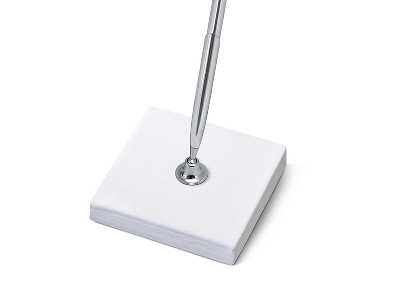- Stojaczek ze srebrnym długopisem, z perłowego papieru w kolorze białym, wymiary ok. 8 x 8 x 16,5 cm.