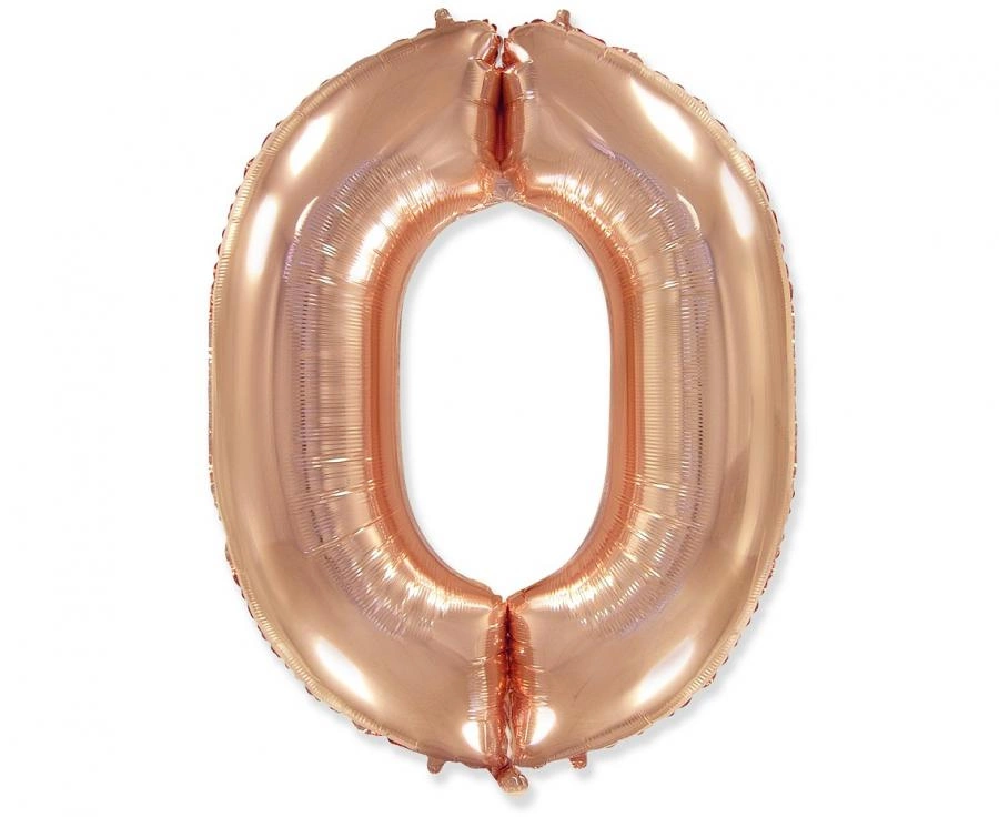 Balon foliowy w kształcie cyfry 0 w kolorze różowo-złotym, przeznaczony do napełnienia helem. Wymiary przed napompowaniem: wysokość 95 cm, szerokość 85 cm. Produkt sprzedawany luzem (1 sztuka, bez napełnienia). Przydatny na urodziny, rocznice i baby shower. Materiał: folia, bez nadruku.