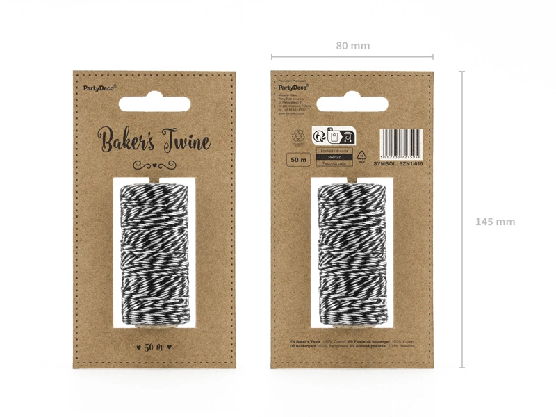 Wprowadź odrobinę elegancji do swoich dekoracji imprezowych dzięki naszemu sznurkowi piekarskiemu w kolorze biało-czarnym. Doskonały do pakowania prezentów, tworzenia ozdób i realizacji wielu innych kreatywnych pomysłów. Długość 50 metrów gwarantuje, że wystarczy na wiele zastosowań.