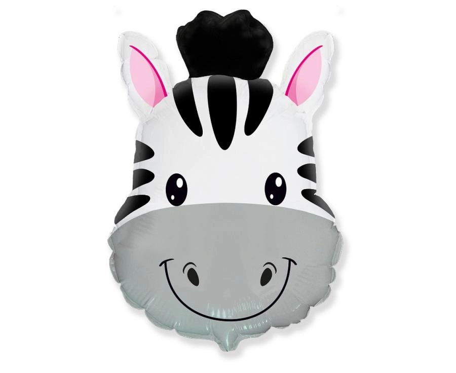 Balon foliowy 24" (ok. 68×48 cm) w kształcie głowy zebry, biało-czarny. Produkt Flexmetal, 1 szt., sprzedawany luzem. Przeznaczony do napełnienia helem — napełnienie powietrzem uniemożliwia unoszenie. Nadaje się na urodziny, baby shower, wieczór panieński i przyjęcia tematyczne.