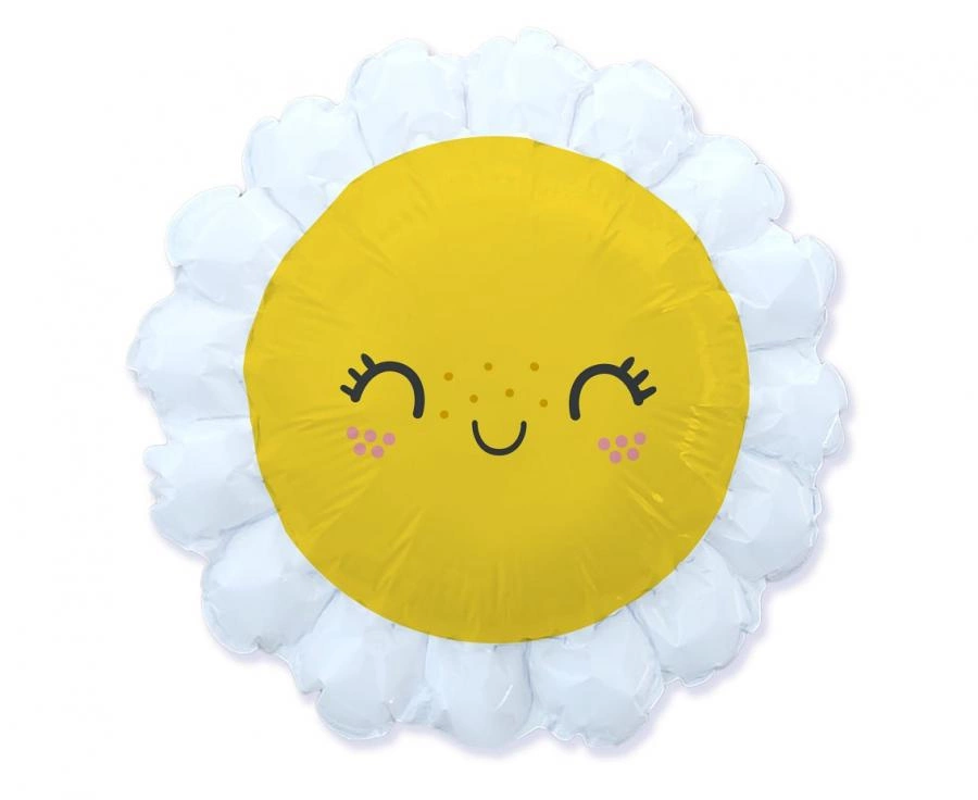 Balon foliowy w kształcie stokrotki z nadrukiem uśmiechniętej twarzy. Kolor biały z żółtym środkiem, rozmiar 24 cale (duży), wymiary przed napompowaniem ok. 74×74 cm. Produkt sprzedawany pojedynczo, producent: Flexmetal. Nadaje się do dekoracji stołu, tła fotograficznego lub aranżacji tematycznych na przyjęcia.