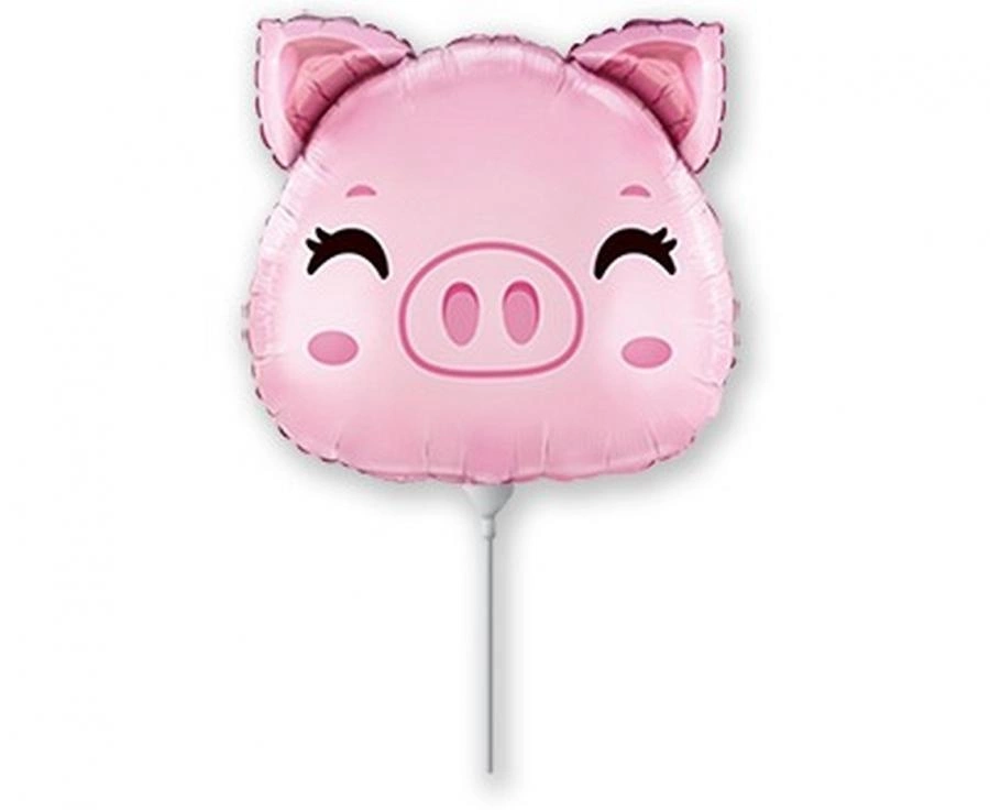 Balon foliowy w kształcie głowy świnki, rozmiar 14" (mini) — około 20×20 cm. Różowy z nadrukiem świnki, sprzedawany pojedynczo. Przeznaczony do napełnienia powietrzem (brak zaworu) — wymaga zgrzania. Nadaje się do dekoracji stołu, tła fotograficznego lub motywu dziecięcego.