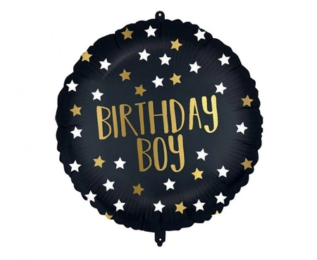 Balon foliowy Black-Gold "Birthday Boy" marki Procos o średnicy 18 cali (ok. 46 cm). Produkt sprzedawany pojedynczo, przeznaczony głównie do napełnienia helem — napełniony powietrzem nie będzie się unosić. Nadaje się jako dekoracja na urodziny, baby shower lub tło fotograficzne.