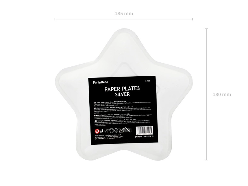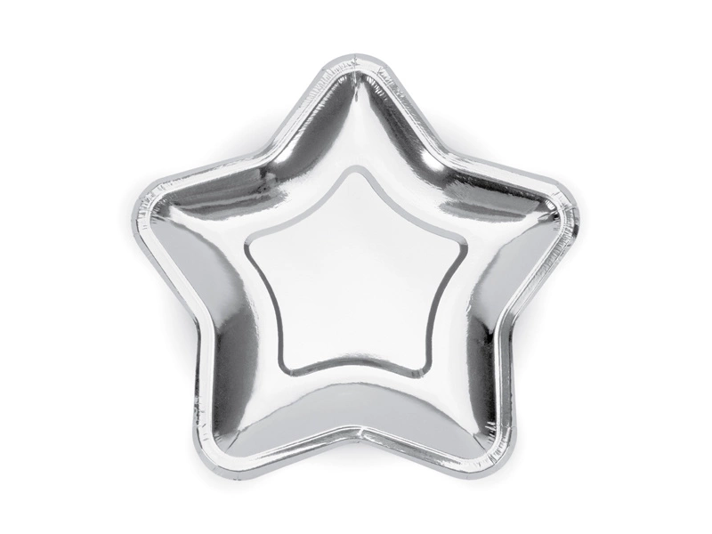 - Talerzyki Gwiazdka wykonane z papieru metalizowanego w kolorze srebrnym, średnica około 18 centymetrów. (1 op. / 6 szt.)