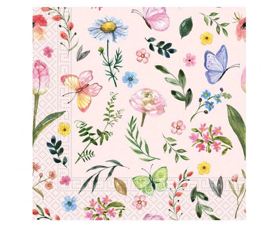 Serwetki papierowe Pink Butterfly 25x25 cm, 20 szt. — papierowe serwetki z kolorowym nadrukiem kwiatów i motyli, przeznaczone do użycia podczas przyjęć: wesel, wieczorów panieńskich, urodzin, baby shower oraz sezonowych dekoracji. Nadają się do nakryć stołu, przekąsek i drobnych dekoracji.