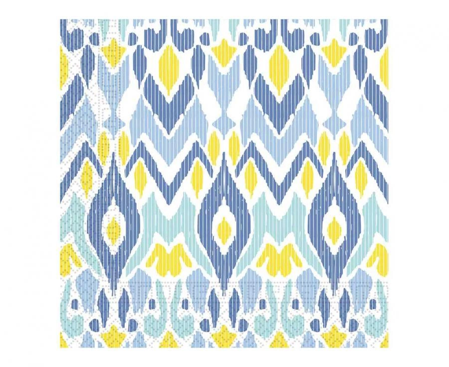 Serwetki papierowe Ethnic Design Decorata o wymiarach 33 x 33 cm, 20 sztuk w opakowaniu. Trójwarstwowe, wykonane z papieru, z nadrukiem w motywie etnicznym w kolorach niebieskim i żółtym. Przeznaczone do nakryć stołu na wesela, urodziny, baby shower oraz imprezy tematyczne.