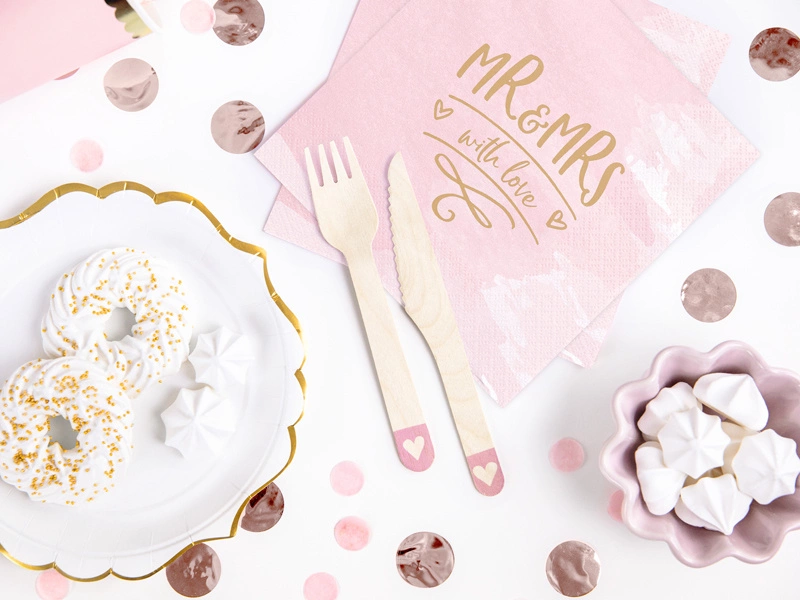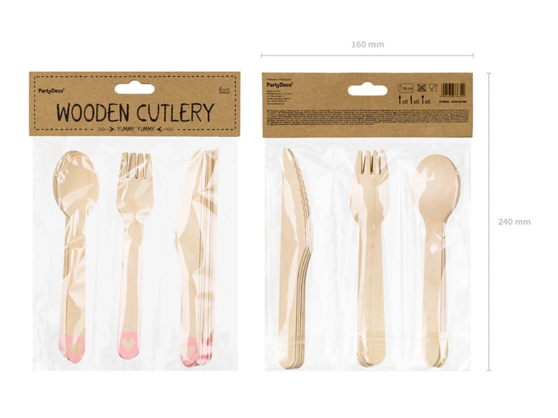 - Sztućce drewniane Serca z nadrukiem w kolorze rumianoróżowym, wysokość około 16 centymetrów, zestaw zawiera 6 łyżek, 6 noży i 6 widelców. (1 op. / 18 szt.)