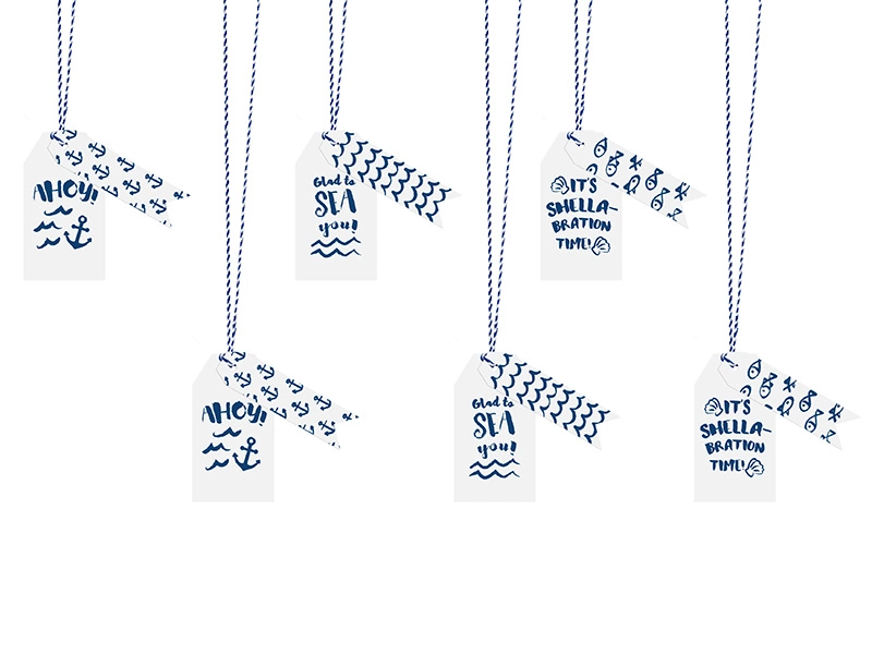 - Zawieszki do prezentów - Ahoy - mix wzorów, zestaw zawiera zawieszki o wymiarach ok. 4x7 cm (3 rodzaje napisów, po 2 szt. z rodzaju) i ok. 2x7 cm (3 rodzaje wzorów, po 2 szt. z rodzaju) oraz ok. 2 m sznurka.