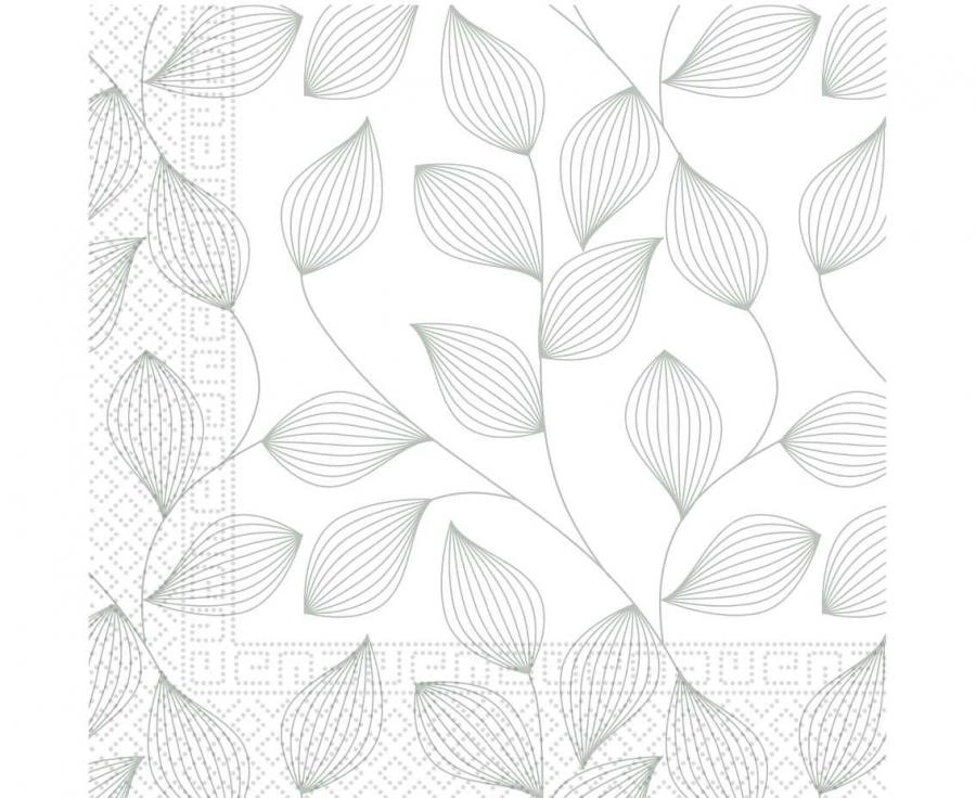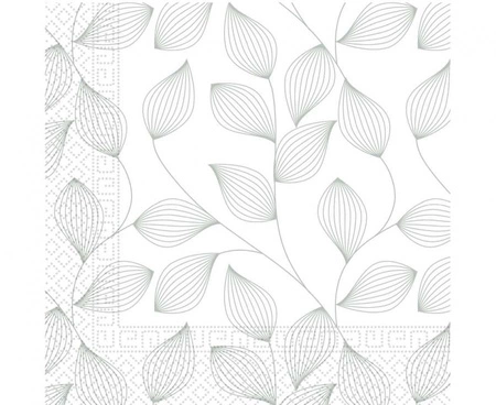 Serwetki papierowe "Leaves" Procos, 33×33 cm, 20 sztuk — białe z szarym nadrukiem liści. Dedykowane do dekoracji stołu na wesele, wieczór panieński, urodziny, baby shower oraz inne przyjęcia; wygodne do serwowania przekąsek i prostego nakrycia stołu.