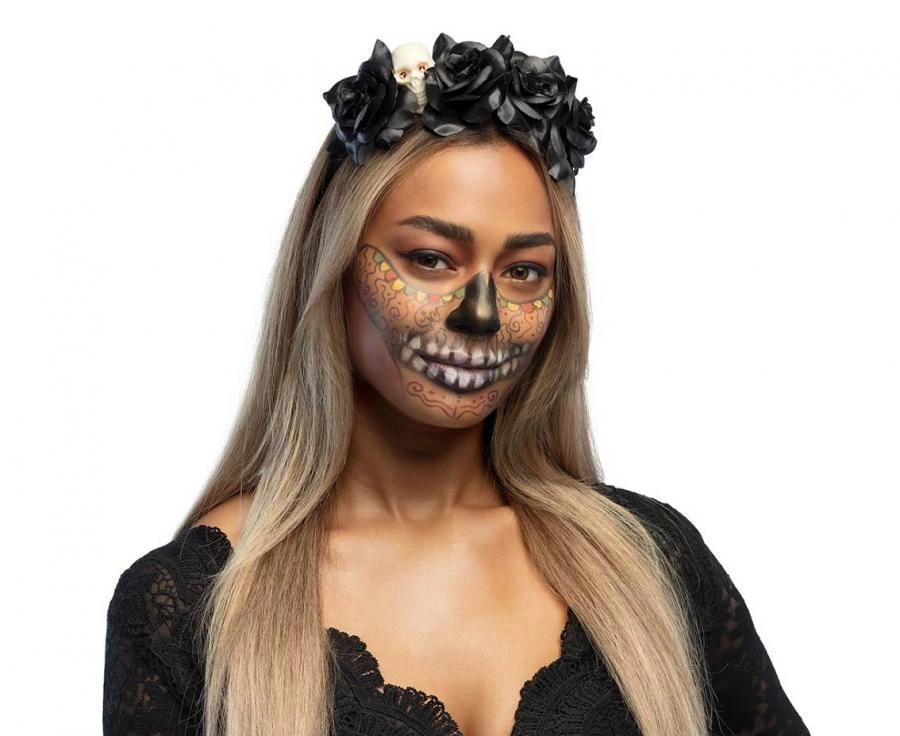 Doskonały dodatek na Halloween • Inspirowana Día de los Muertos • Stabilnie trzyma się na głowie • Efektowne zdobienia • Idealna do stylizacji w klimacie latino • 1 szt.