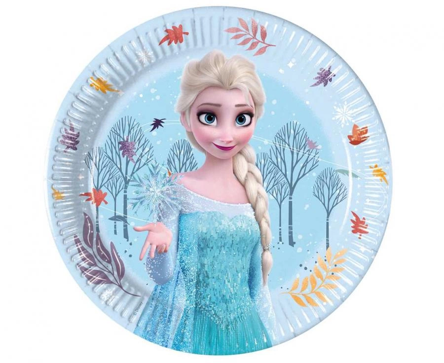 Talerzyki papierowe Frozen Idyllic Wonder, średnica 23 cm, opakowanie 8 sztuk. Okrągłe talerze z papieru z licencjonowanym nadrukiem Kraina Lodu (producent: Procos). Przeznaczone do serwowania ciastek, deserów i drobnych przekąsek podczas urodzin, baby shower, wieczoru panieńskiego lub innych przyjęć tematycznych.