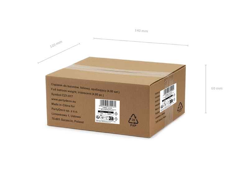 - Ciężarek do balonów owinięty folią w kolorze opalizującym, wysokość ok. 7 cm, waga ok. 130 g. (1 op. / 4 szt.)