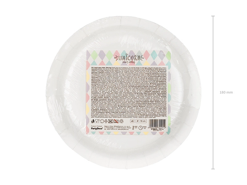 Kolor: Wielokolorowe z motywem jednorożca i gwiazdek Rozmiar: Średnica ok. 18 cm Materiał: Papier