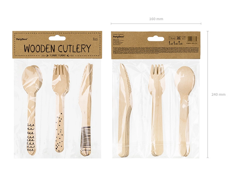 - Sztućce drewniane z nadrukiem w kolorze czarnym, mix wzorów, wysokość około 16 centymetrów, zestaw zawiera 6 łyżek, 6 noży i 6 widelców. (1 op. / 18 szt.)