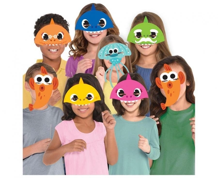 Maski papierowe z kolekcji Baby Shark, 8 sztuk. Wykonane z laminowanej, grubej tektury, z wycięciami na oczy i mocowaniem na elastyczną gumkę. Kolorowe wzory przedstawiają podwodne zwierzęta. Najlepiej sprawdzą się na dziecięcych urodzinach, zabawach tematycznych i karnawale.