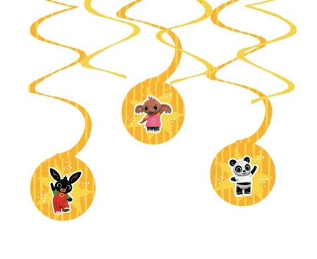 Dekoracja spiralna „Bing” — zestaw 6 papierowych zawieszek o długości 60 cm każda z kolorowymi grafikami postaci z bajki. Przeznaczona głównie na przyjęcia dziecięce, urodziny oraz baby shower; przejrzysta konstrukcja ułatwia powieszenie nad stołem, w kątach pomieszczenia lub jako element tła fotograficznego.