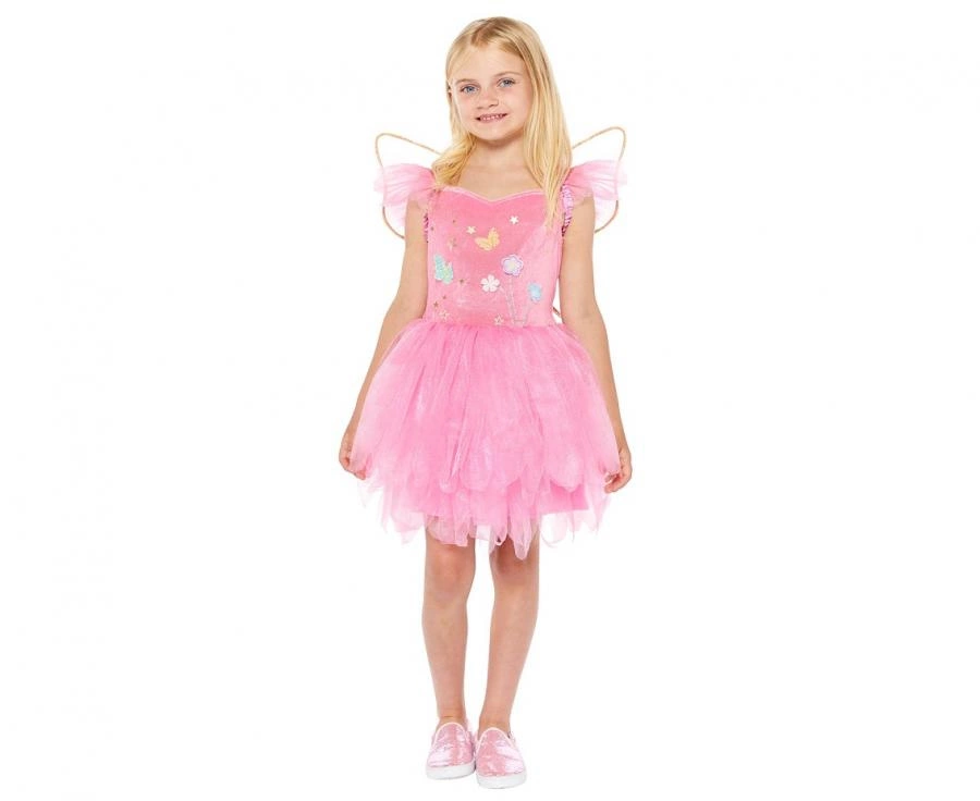 Strój Pink Fairy dla dzieci w rozmiarze 4–6 lat. Kompletny kostium wróżki obejmuje elastyczny aksamitny gorset, warstwową spódniczkę z tiulu i organzy oraz podszycie z poly-satyny. Produkt wykonany z poliesteru, 1 sztuka, producent Amscan. Przydatny na urodziny, bal karnawałowy i Halloween.