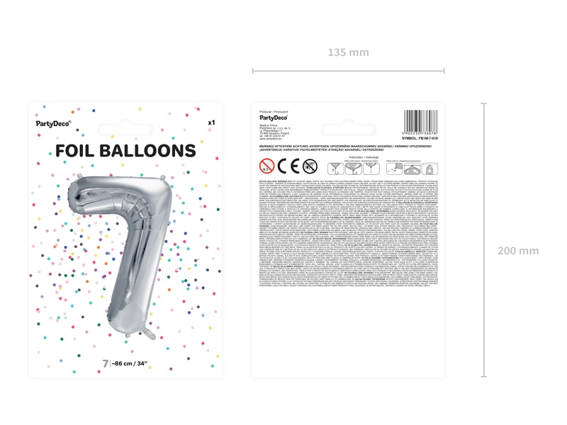 - Balon foliowy metalizowany Cyfra ''7'' w kolorze srebrnym, rozmiar przed napompowaniem ok. 100 cm (39''), rozmiar po napompowaniu ok. 86 cm (34''). Do napomowania powietrzem i helem.