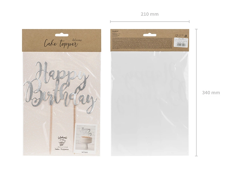 - Topper na tort Happy Birthday, wykonany z papieru lustrzanego w kolorze srebrnym, wysokość ok. 22,5 cm.