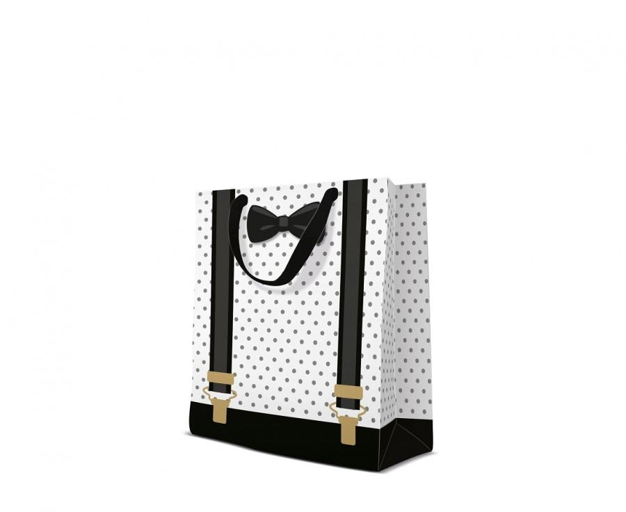 Torebka prezentowa Elegant Man 20x25x10 cm — papierowa torebka z nadrukiem szelek i muchy, w kolorach białym, czarnym i złotym. Przeznaczona do pakowania drobnych i średnich prezentów: Dzień Ojca, Dzień Chłopaka, urodziny, imieniny oraz jako opakowanie dla upominków na wieczór kawalerski.