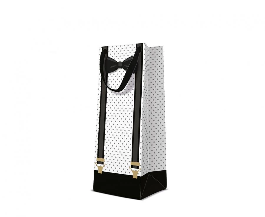 Torebka prezentowa na wino Elegant Man (12×37×10 cm) — papierowa torba w odcieniach bieli, czerni i złota z nadrukiem muchy i szelek. Przeznaczona do butelek wina, szampana i innych alkoholi; produkt firmy PAW, przydatna na wesela, urodziny, wieczory panieńskie i święta.