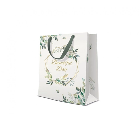 Torebka prezentowa z roślinnym motywem i napisem „Beautiful Day”, wykonana z papieru, w wymiarach 20 x 25 x 10 cm. Kolory: biały, zielony i złoty. Przeznaczona do pakowania pojedynczych upominków i drobnych gadżetów na wesela, urodziny, baby shower, wieczory panieńskie oraz inne przyjęcia. Lekka i gotowa do użycia od razu.