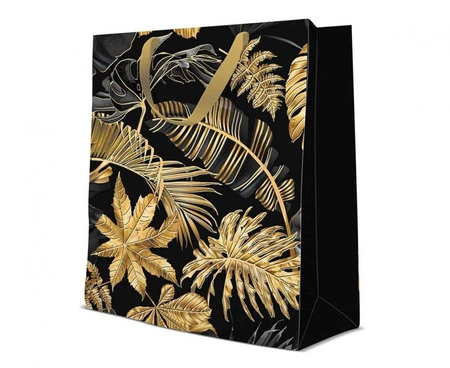Torebka prezentowa Premium "Liście" (duża) to papierowa torba ozdobna z czarnym tłem i nadrukiem złotych liści, przeznaczona do pakowania prezentów na wesela, urodziny, baby shower, walentynki i Boże Narodzenie. Wymiary: 26,5 x 33,5 x 13 cm; materiał: papier.