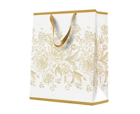 Torebka prezentowa PAW, wymiary 26,5 x 33,5 x 13 cm, wykonana z papieru w kolorze białym z nadrukiem złotych róż. Przeznaczona do pakowania prezentów średniej wielkości — sprawdzi się na wesela, urodziny, baby shower, imieniny, Boże Narodzenie i Walentynki.