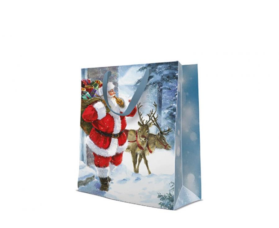 Torebka prezentowa "Santa is Coming" o wymiarach 26,5×13×33,5 cm. Duża torba z motywem Mikołaja, przeznaczona do pakowania prezentów świątecznych. Najlepiej nadaje się do pakowania upominków pod choinkę lub do wręczenia podczas świątecznych spotkań rodzinnych.