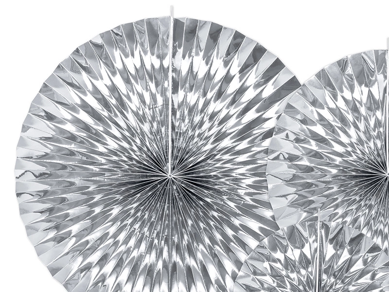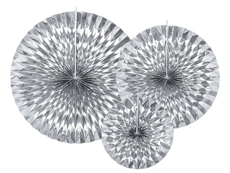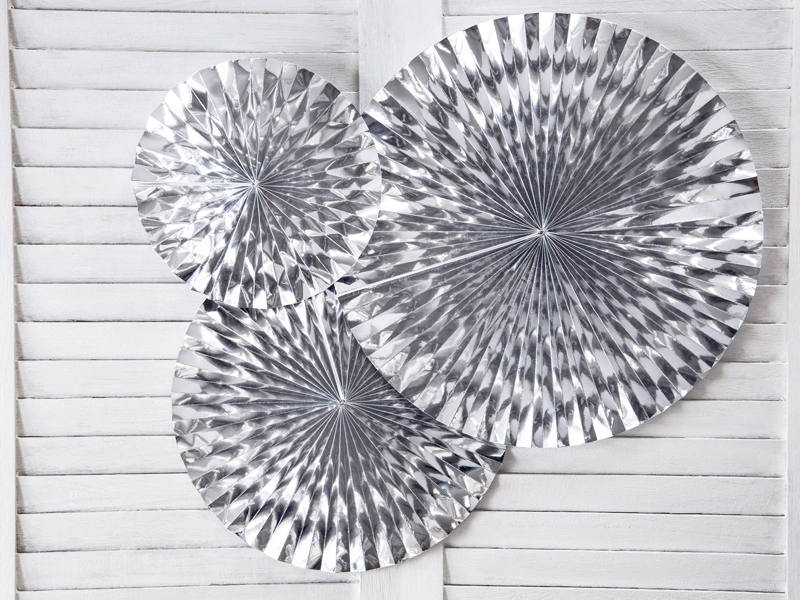 - Rozety dekoracyjne w kolorze srebrnym lustrzanym, średnice ok.: 40 cm, 32 cm i 23 cm. (1 op. / 3 szt.)