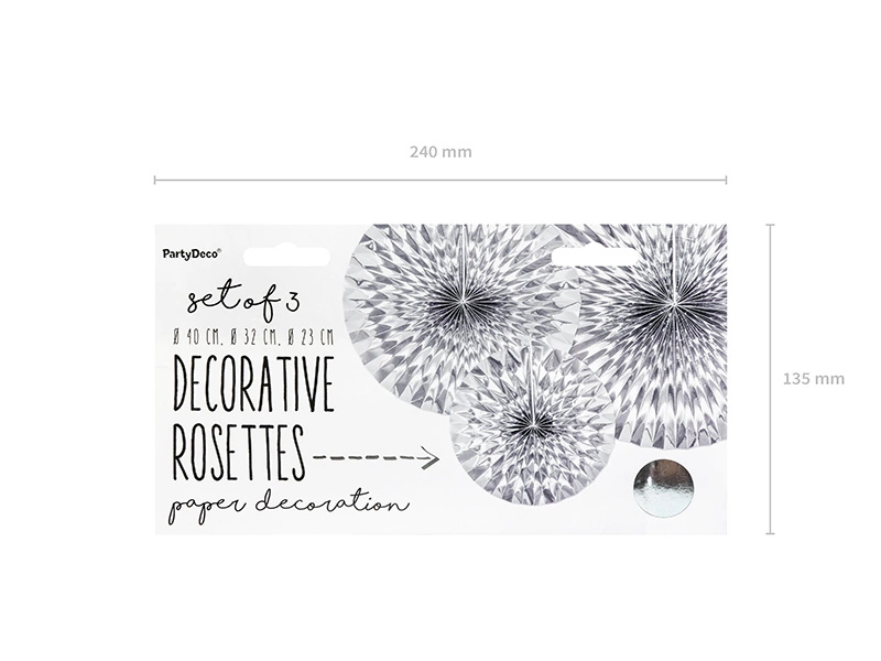 Chcesz dodać odrobinę blasku i elegancji do swojej imprezy? Nasze srebrne rozety dekoracyjne są idealnym rozwiązaniem! Te lustrzane ozdoby wprowadzą wyjątkowy klimat na Twoje wesele, wieczór panieński, urodziny, Halloween, baby shower, Boże Narodzenie, Walentynki i wiele innych okazji. W zestawie znajdziesz trzy rozety o średnicach 40 cm, 32 cm i 23 cm, które z łatwością dopasujesz do każdej przestrzeni.