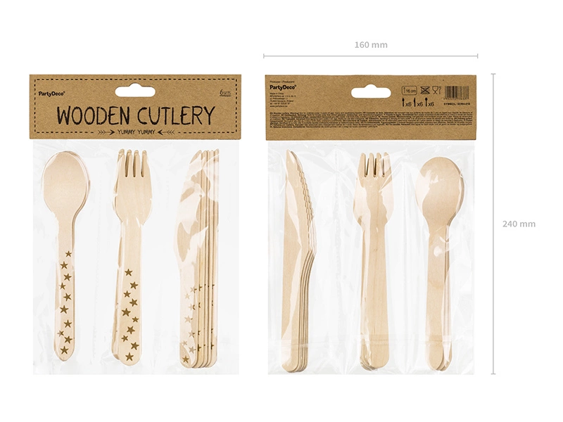 - Sztućce drewniane Gwiazdki z nadrukiem w kolorze złotym, wysokość ok. 16 cm, zestaw zawiera 6 łyżek, 6 noży i 6 widelców. (1 op. / 18 szt.)