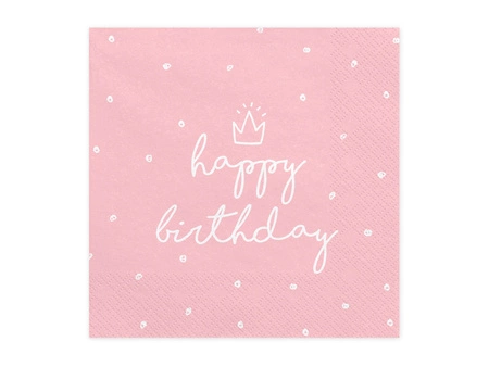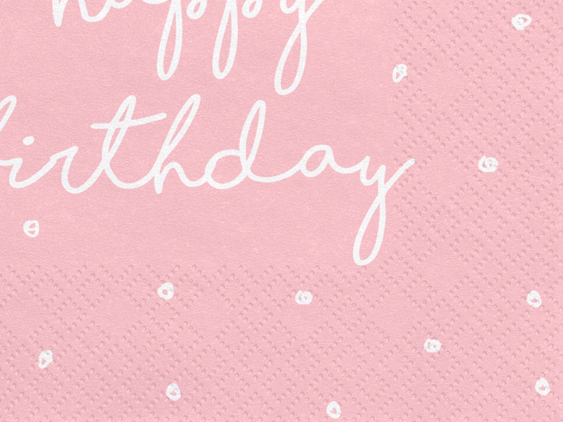 - Serwetki trójwarstwowe Happy Birthday w kolorze jasnoróżowym z białym nadrukiem, wymiary 33 x 33 cm. (1 op. / 20 szt.)