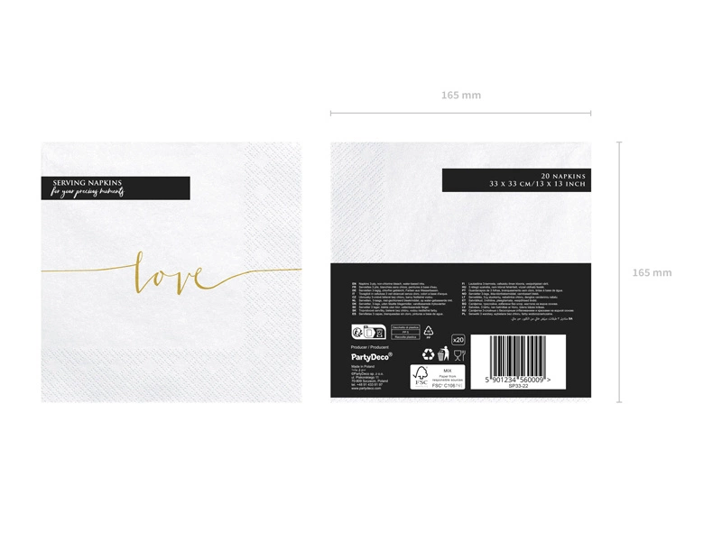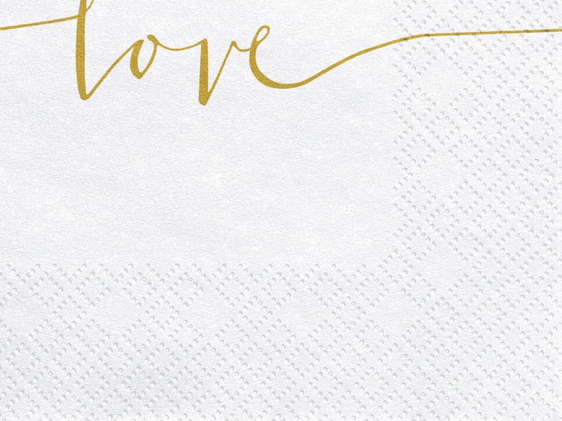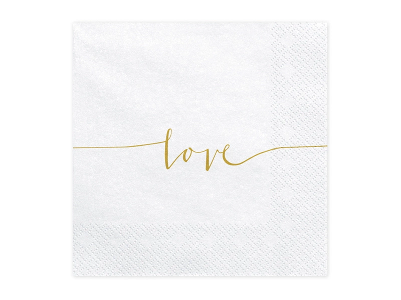 - Serwetki trójwarstwowe w kolorze białym ze złotym napisem Love, wymiary po rozłożeniu ok. 33 x 33 cm, wymiary po złożeniu ok. 16,5 x 16,5 cm. (1 op. / 20 szt.)