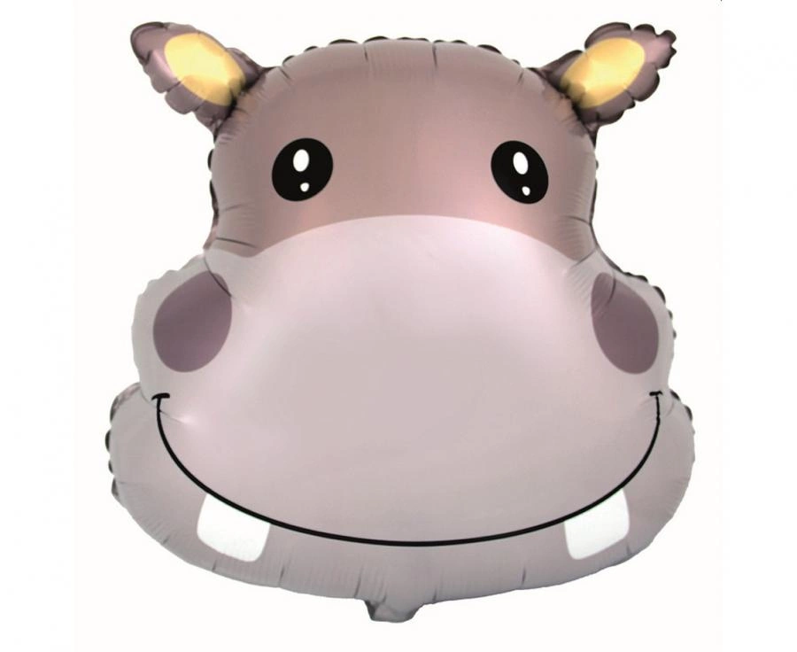 Balon foliowy w kształcie głowy hipopotama, rozmiar 24" (ok. 56×56 cm), 1 sztuka. Przeznaczony do napełnienia helem (będzie się unosić) lub powietrzem (nie unosi). Sprawdzi się na urodzinach, baby shower, wieczorach panieńskich oraz jako element tła fotograficznego.