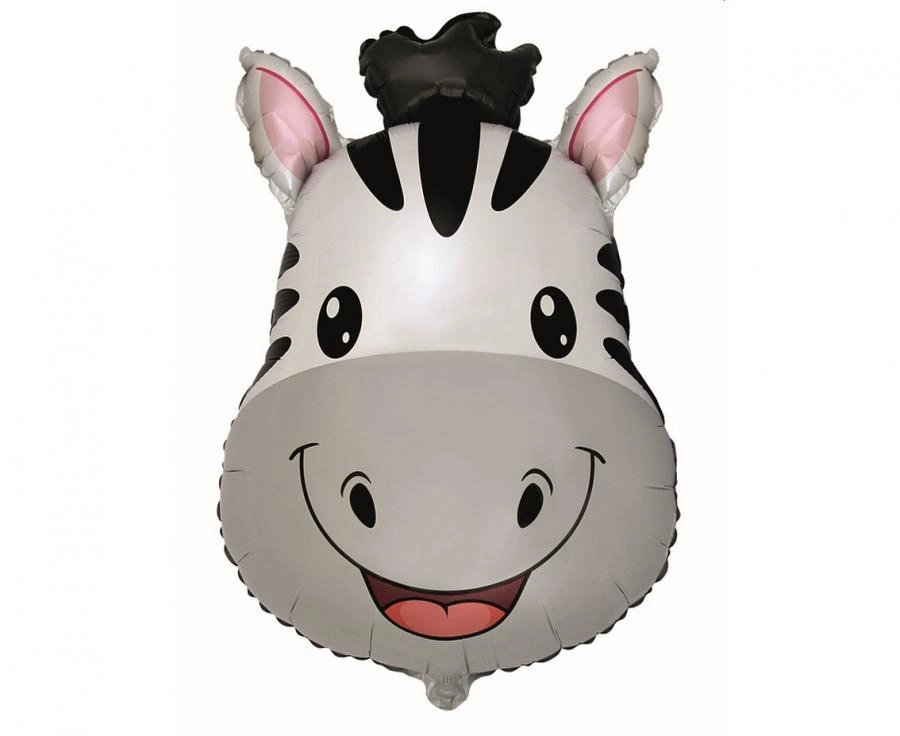 Balon foliowy w kształcie głowy zebry, rozmiar 24" (ok. 68 × 48 cm), 1 sztuka od producenta Flexmetal. Produkt przeznaczony do napełnienia helem (przy powietrzu nie unosi się). Nadaje się na urodziny, przyjęcia tematyczne, baby shower oraz imprezy dziecięce.