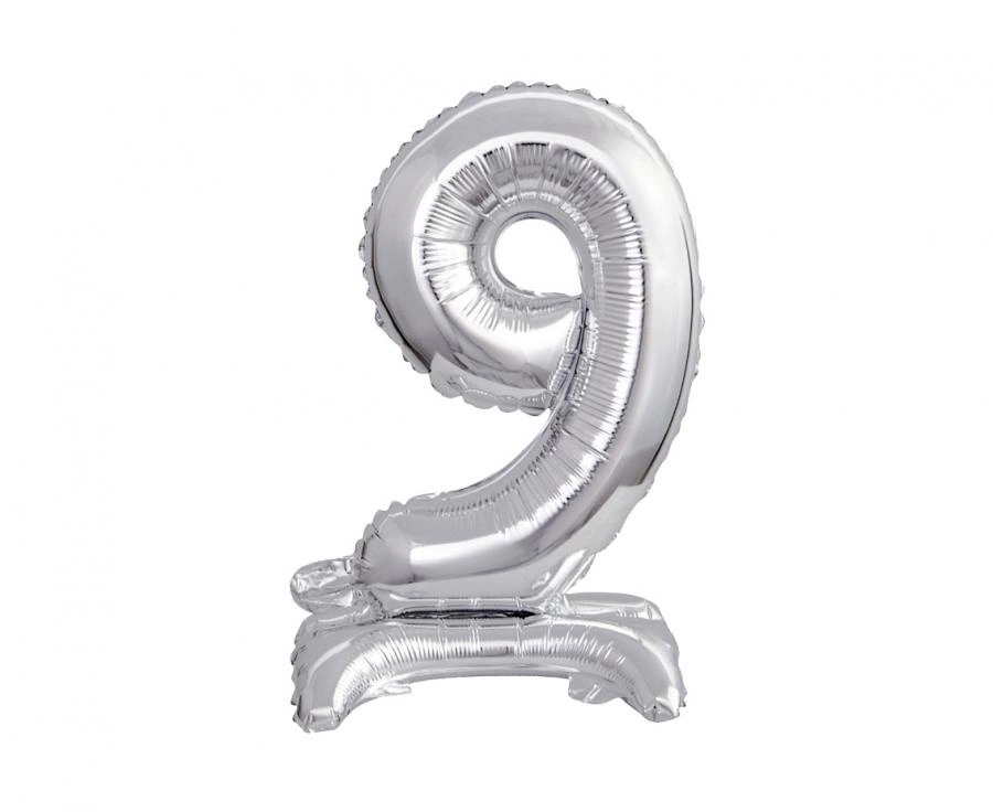 Balon foliowy w kształcie cyfry 9 o wysokości około 38 cm, w kolorze srebrnym. Produkt przeznaczony do napełnienia powietrzem; w opakowaniu znajduje się 1 sztuka i dołączona rurka do pompowania. Nadaje się jako dekoracja stołu, element tła do zdjęć lub uzupełnienie kompozycji na urodziny, wieczór panieński czy rocznicę.