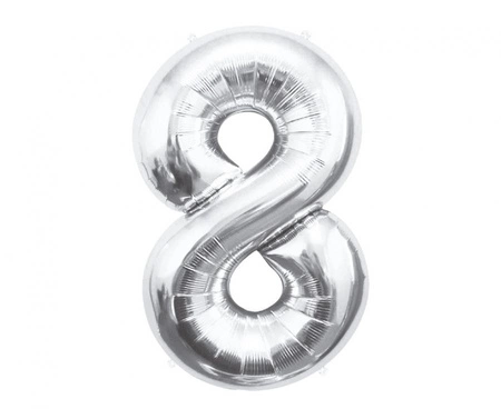 Balon foliowy w kształcie cyfry 8, kolor srebrny, rozmiar po napompowaniu 85 cm. Produkt 1 szt. od producenta GoDan (kolekcja Beauty&Charm). Przeznaczony do napełnienia helem — przy napełnieniu powietrzem nie będzie się unosić. Przydatny na urodziny, rocznice i inne imprezy z oznaczeniem wieku.