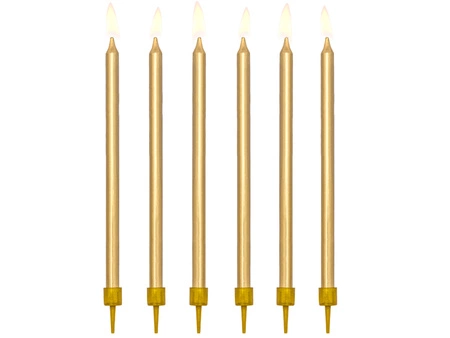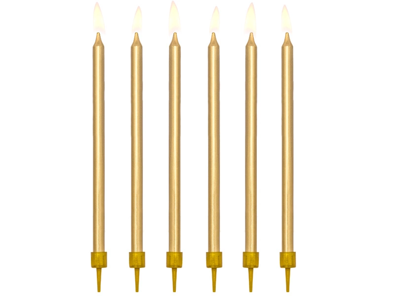 - Świeczki urodzinowe gładkie w kolorze złotym metalizowanym, rozmiar ok. 12,5 cm, w zestawie 12 świeczek i 12 podstawek. (1 op. / 12 szt.)