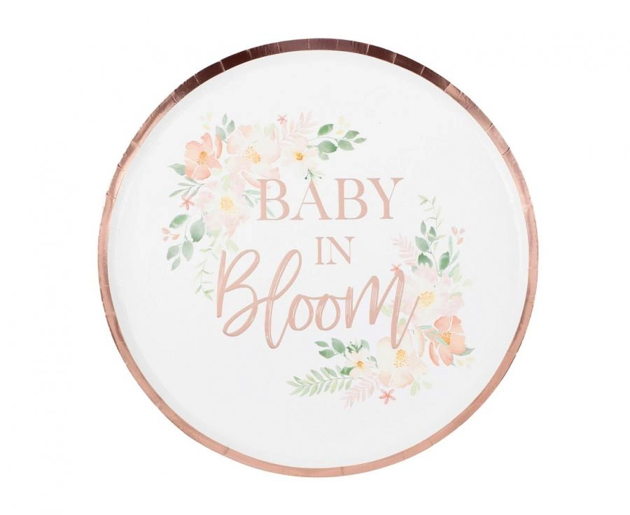 Talerzyki papierowe Floral Baby in Bloom o średnicy 24 cm, 8 sztuk w opakowaniu. Okrągłe, wykonane w 100% z papieru, z wielokolorowym nadrukiem „Baby in Bloom”. Przeznaczone głównie do baby shower, przyjęć urodzinowych, wieczorów panieńskich oraz lekkich serwowań podczas imprez.
