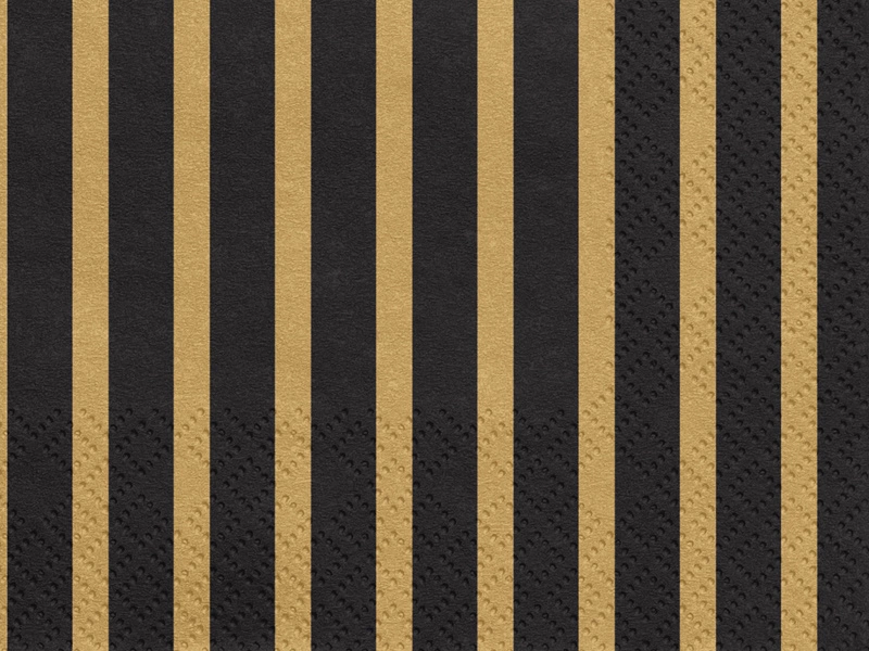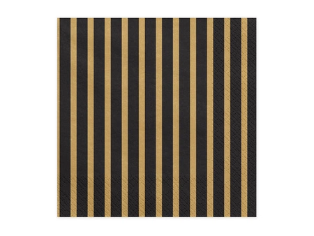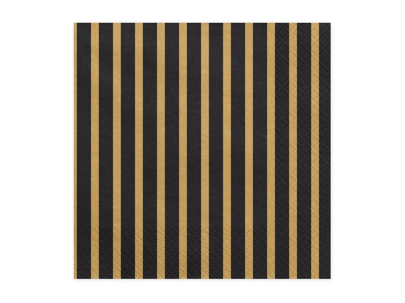 - Serwetki papierowe w kolorze czarnym ze złotymi paskami, wymiary po rozłożeniu ok. 33 x 33 cm, wymiary po złożeniu ok. 16,5 x 16,5 cm. (1 op. / 20 szt.)