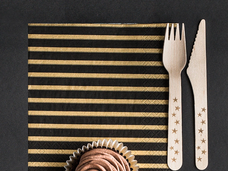 - Aby dodać jeszcze więcej blasku, rozważ użycie złotych sztućców i czarnych talerzy, które idealnie skomponują się z serwetkami.