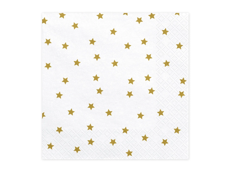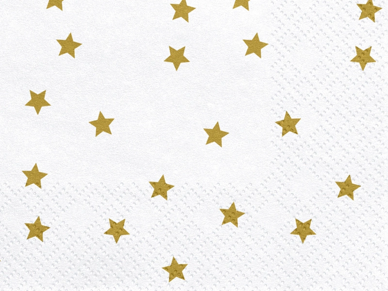 - Serwetki papierowe Gwiazdki w kolorze białym ze złotym nadrukiem, wymiary po rozłożeniu ok. 33 x 33 cm, wymiary po złożeniu ok. 16,5 x 16,5 cm. (1 op. / 20 szt.)